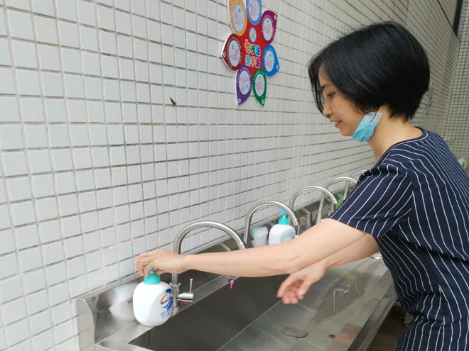 后勤人員對大堂、樓梯、走廊、洗手池等進(jìn)行清潔消毒
