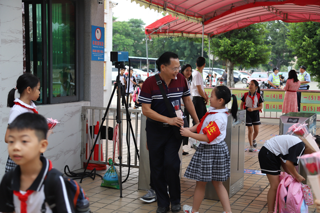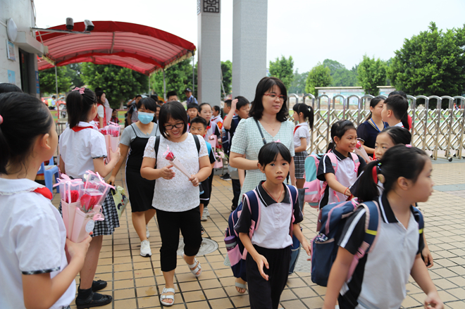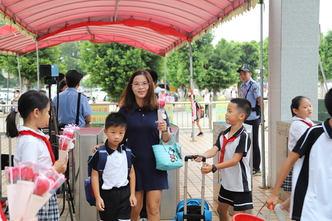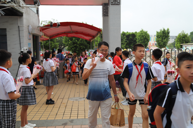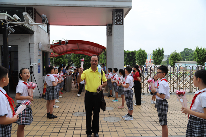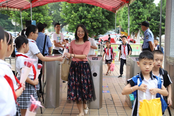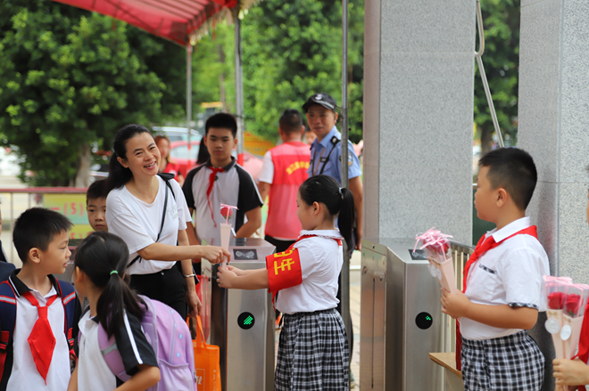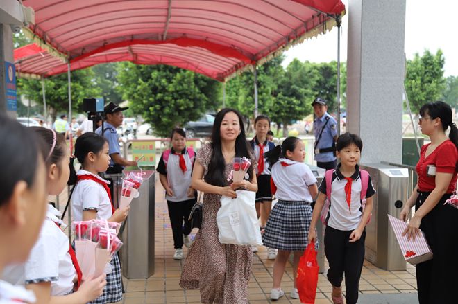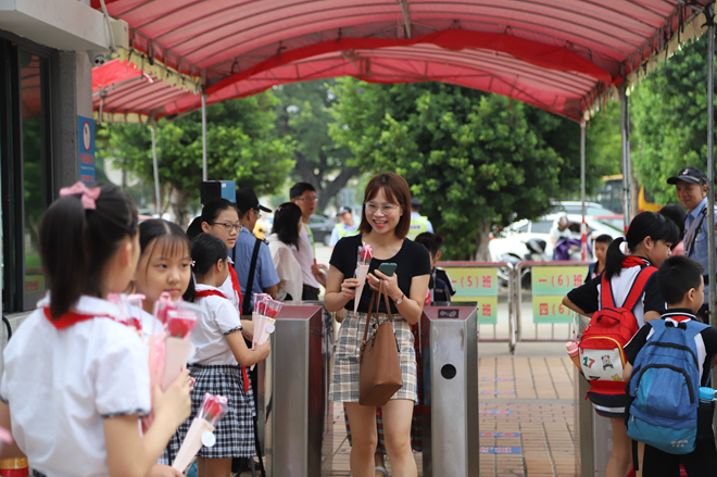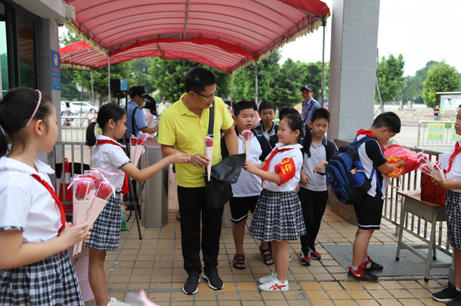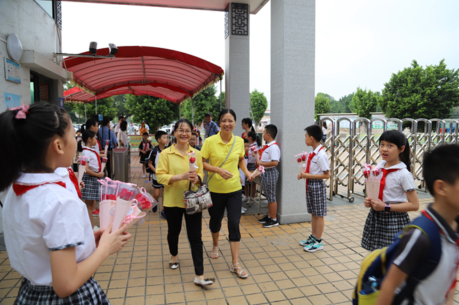 9月10日早上,少先隊隊員代表們手捧鮮花列隊為教師們送花。一朵鮮花,一個微笑,一份感恩,就這樣在華東小學(xué)校門口傳遞著。