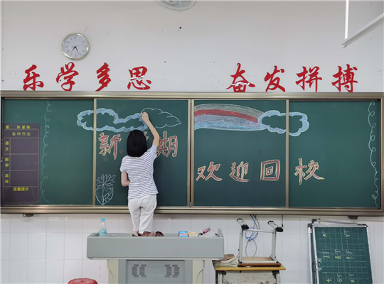 新學(xué)期 新環(huán)境 新希望 老師正在布置精美的黑板報迎接同學(xué)們回校