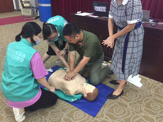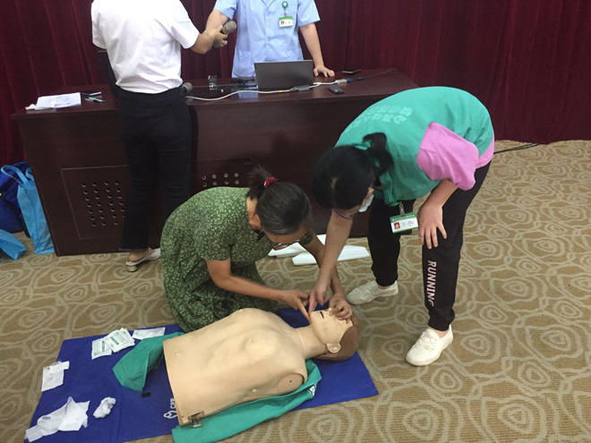 本次知識講座分為理論知識講解和實際操作兩部分,張醫(yī)生采用PPT形式,從心跳呼吸驟??砂l(fā)生的場所、個體、心肺復(fù)蘇概念、黃金救命時間等方面做了詳細的介紹,同時結(jié)合不同傷情下應(yīng)采取的不同急救措施,對心肺復(fù)蘇各環(huán)節(jié)技術(shù)和流程進行了現(xiàn)場示范。