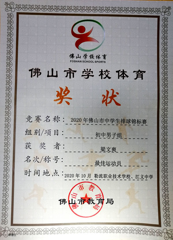 2020年10月30日至11月1日,由佛山市教育局主辦,順德區(qū)教育局承辦,順德區(qū)勒流江義中學(xué)和順德區(qū)勒流職業(yè)技術(shù)學(xué)校協(xié)辦的2020年佛山市中學(xué)生排球錦標(biāo)賽圓滿落下帷幕,來(lái)自全市五區(qū)和市直屬學(xué)校共21支球隊(duì)248名運(yùn)動(dòng)員齊聚勒流。江義中學(xué)男子排球隊(duì)代表順德區(qū)初中男子組參賽,經(jīng)過(guò)3天的比賽,憑借主場(chǎng)優(yōu)勢(shì),再次蟬聯(lián)佛山市中學(xué)生排球錦標(biāo)賽初中組冠軍,實(shí)現(xiàn)五連冠。梁文爽同學(xué)評(píng)為最佳運(yùn)動(dòng)員,伍劍華老師評(píng)為優(yōu)秀體育指導(dǎo)老師。