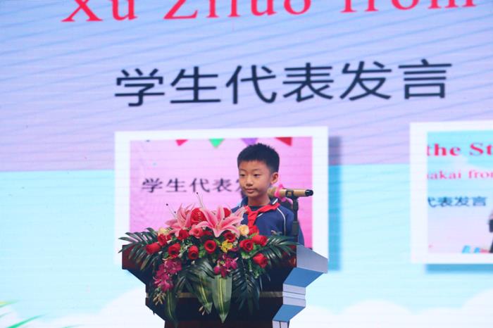 表演結(jié)束后,三年(8)班徐梓洛同學(xué)作為英語特色班代表發(fā)言。他用流利的英語跟大家分享了在本次英語嘉年華中的收獲以及學(xué)習(xí)英語的心得體會,表達(dá)了對英語的喜愛之情,感謝學(xué)校提供的英語特色課程讓他的英語學(xué)習(xí)之路變得多姿多彩。同時(shí)他希望自己能夠帶著一口流利的英語環(huán)游世界與世界各地的人交朋友,向他們介紹我們國家,開啟在英語世界的多彩夢想。