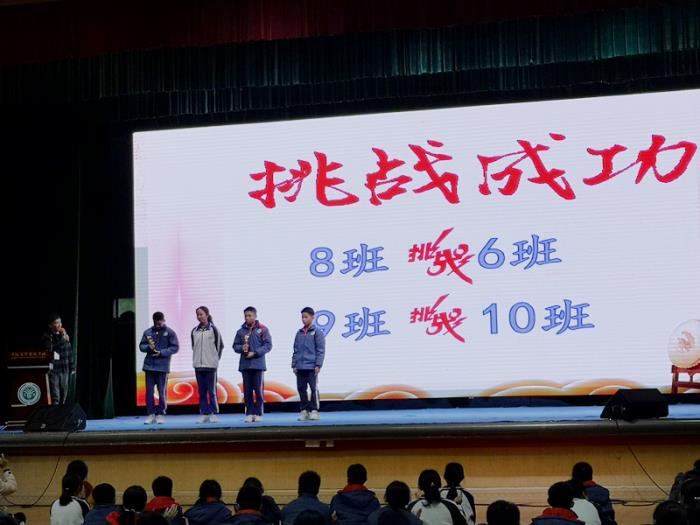 接著,八(6)班、八(10)班的代表將象征著優(yōu)勝的大拇指獎(jiǎng)杯交給了八(8)班、八(9)班的代表。一陣掌聲過(guò)后,八(4)班向本次的狀元班八(8)班發(fā)出了挑戰(zhàn)。在班代表宋小宇同學(xué)的帶領(lǐng)下,八(4)班斗志昂揚(yáng),口號(hào)響亮,展現(xiàn)出了有為班良好的精神面貌,八(8)班在代表陳舒涵同學(xué)的鼓動(dòng)下,信心十足,從容應(yīng)戰(zhàn)。