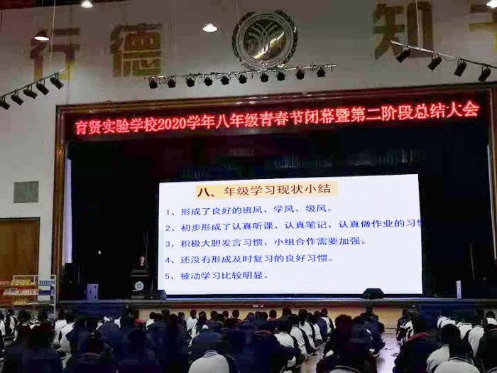 青春如歌,吟唱著美好與詩(shī)意;青春如火,燃燒著激情與活力;青春如花,綻放著智慧和希望。12月16日下午,育賢實(shí)驗(yàn)學(xué)校八年級(jí)青春節(jié)閉幕式暨第二階段測(cè)試總結(jié)大會(huì)在體育館如期舉行。大會(huì)由八年級(jí)級(jí)長(zhǎng)陶連青老師主持。盧林副校長(zhǎng)、張紅軍主任、吳本新主任出席了本次活動(dòng)。