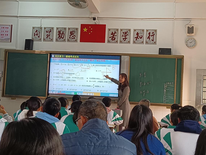 課堂上周偉萍老師從基礎(chǔ)考點過關(guān)開始,從??贾R點與學生循循善誘,語言親切,讓學生如沐春風,學生如在和風暖陽中收獲知識。之后用思維導圖進行歸納。而后通過重難點突破中的用希沃白板的函數(shù)技術(shù)對反比例函數(shù)幾何性質(zhì)進行動態(tài)演示,最后點亮廣東省中考壓軸題的反比例函數(shù)的思維火花,使數(shù)學課堂與信息技術(shù)高度相融合。陽山老師聽完課后不經(jīng)意間脫口而出的“厲害”道出所有老師的聽課心聲。