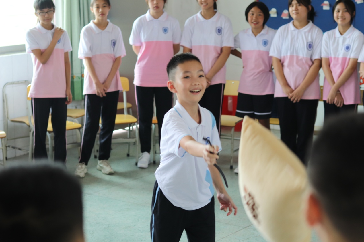 為了讓同學(xué)們更好地更快地記住彼此的名字,全體同學(xué)站成一圈,玩“丟抱枕,說名字”的游戲。