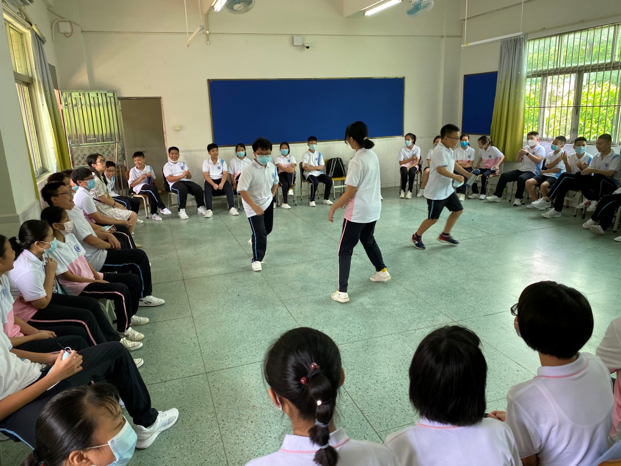 各班同學(xué)圍成一個大圓,以“大風(fēng)吹”活動來暖身,迅速拉近同學(xué)們間的距離,讓大家在活躍的氣氛中放松心情。