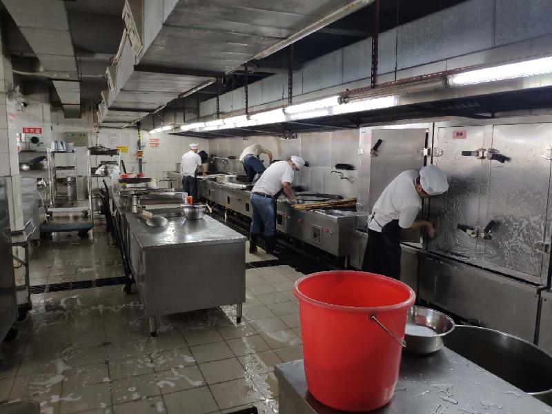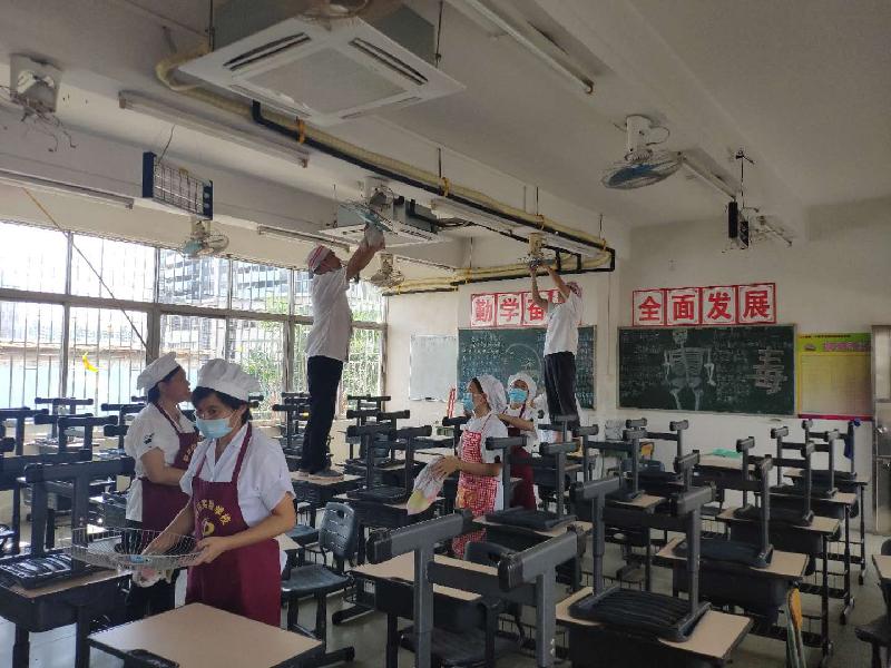 后勤人員不畏酷暑,對(duì)教學(xué)區(qū)、生活區(qū)、飯?zhí)眠M(jìn)行全方位、無(wú)死角的環(huán)境衛(wèi)生整治和通風(fēng)消毒工作。