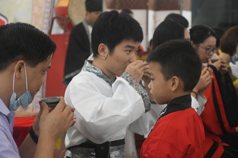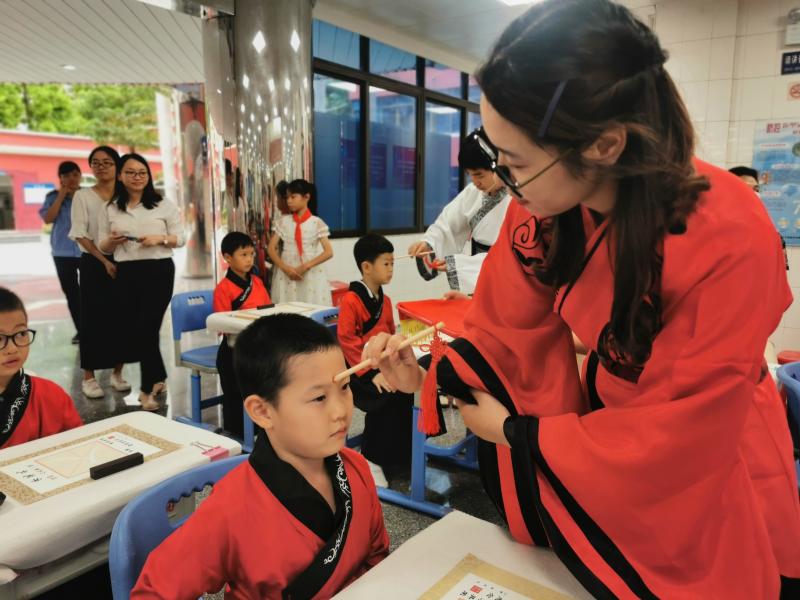 許勇輝校長(zhǎng)、德育處李福古副主任、譚淑儀級(jí)長(zhǎng)、班主任和書法高輝老師,一一為學(xué)子點(diǎn)上朱砂。一顆顆紅痣啟心智,寄托著一個(gè)個(gè)美好的愿望;一顆顆紅痣祝成長(zhǎng),包含著父母師長(zhǎng)的深深情誼;一顆顆紅痣促奮發(fā),凝結(jié)著中華五千年文化的悠悠情結(jié)。