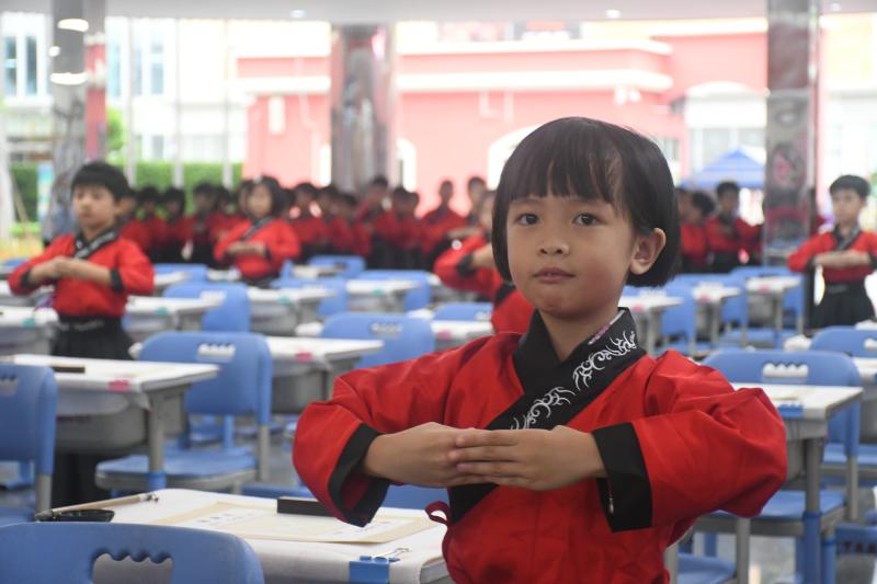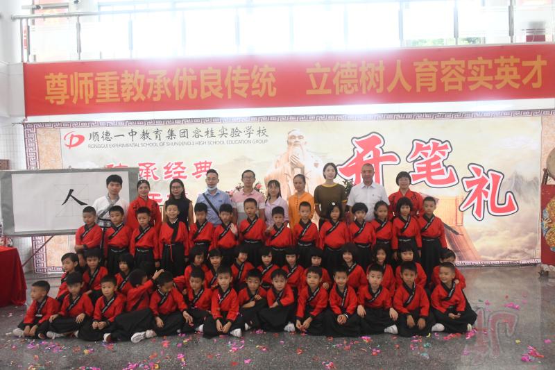 9月28日,一個(gè)莊嚴(yán)恢弘的主席臺(tái)搭建在大堂正中央,兩邊屏風(fēng)環(huán)繞,禮、儀、孝、悌、忠、信、廉、恥的條幅點(diǎn)綴其中。順德一中教育集團(tuán)容桂實(shí)驗(yàn)學(xué)校一年級(jí)新生“開(kāi)筆禮”儀式,就這樣成功地?fù)屨剂藢W(xué)校頭條。穿戴整齊的漢服萌娃們,跟隨級(jí)長(zhǎng)譚淑儀老師的引領(lǐng),跟隨班主任老師的腳步,踏著古詩(shī)韻律,合掌緩緩進(jìn)入會(huì)場(chǎng),拉開(kāi)了活動(dòng)的序幕。嘉賓席上,許勇輝先生校長(zhǎng)、德育處李福古副主任等行政領(lǐng)導(dǎo)與一年級(jí)的家長(zhǎng)朋友們,共同見(jiàn)證了這一神圣的時(shí)刻,現(xiàn)場(chǎng)響起一片經(jīng)久不息的贊嘆聲和掌聲。