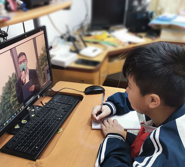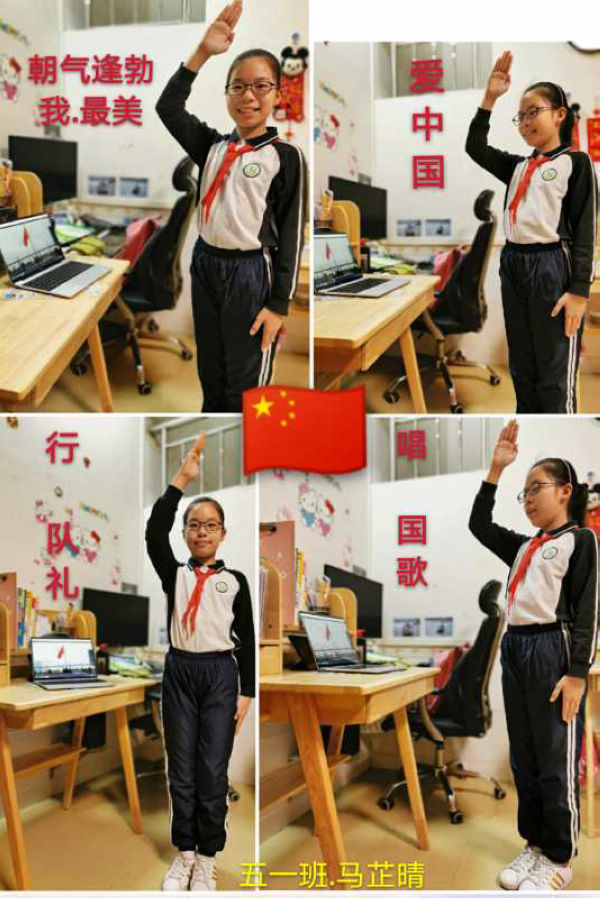 “升國(guó)旗、奏唱國(guó)歌,敬禮”,鮮艷的五星紅旗冉冉升起,奮發(fā)的少先隊(duì)員們敬著標(biāo)準(zhǔn)的隊(duì)禮,鏗鏘的國(guó)歌奏響在全校師生家里,滾燙的愛(ài)國(guó)之情在每一位心中升騰.......這一刻,我們雖身處不同地方,但我們都懷揣著一顆熾熱的赤子之心,共同祈愿能早日回歸等待了我們?cè)S久的校園!