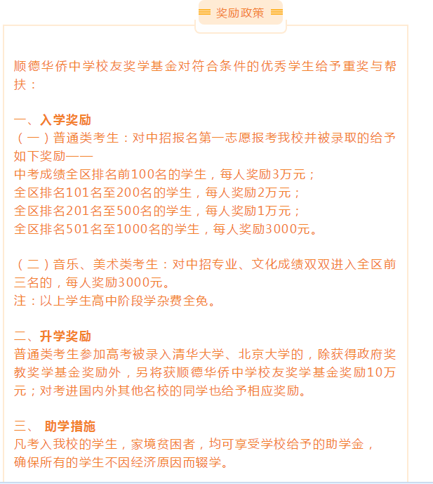 這里有廣闊無邊的發(fā)展前景。學校定位卓越。是廣東省南粵革命老區(qū)英才計劃基地學校,是佛山市“精品高中創(chuàng)建學?!保樀聟^(qū)僅有三所)、順德區(qū)“優(yōu)質(zhì)品牌高中”;成立了以華僑中學為核心的高品質(zhì)的小初高貫通的華僑教育集團;設立了順德首創(chuàng)的“港澳臺生班”;參加國際中學生信息及通訊科技大賽(INFOMATRIX),獲世界金獎;是華南理工大學、東南大學等近十所名校的優(yōu)質(zhì)生源基地;與中山大學、北京師范大學、華南理工大學、華南師范大學、暨南大學、中山紀念中學、執(zhí)信中學、湖南師范大學附屬中學等國內(nèi)名校開展教育教學合作,設立精英班、創(chuàng)新班,開展創(chuàng)新人才培養(yǎng)實驗項目。