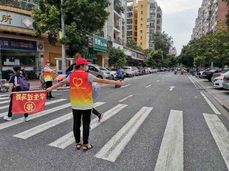 時值2017年9月,楊潤懿老師組織成立了學校的服務隊,他是我的班主任和語文老師,在他的“鼓動”下,媽媽就加入了服務隊。現(xiàn)在我已經(jīng)讀初中了,當媽媽知道容桂小學成立志愿者服務隊時,又成為了服務隊的一員。