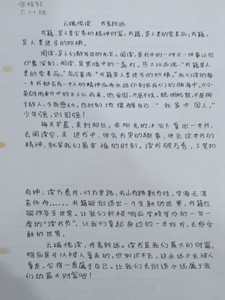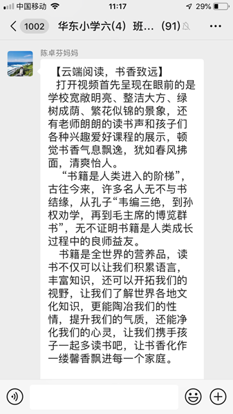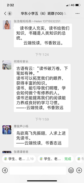 恰逢今天是五、六年級學(xué)生返校,于是本次活動分線下和線上釘釘直播兩部分進(jìn)行。首先,由龍家怡老師向五、六年級全體師生介紹本次活動的意義和介紹讀書節(jié)啟動儀式活動流程。其次,由葉麗燕副校長詳細(xì)解讀本學(xué)期讀書節(jié)活動方案。然后,學(xué)生們觀看讀書節(jié)啟動儀式視頻并撰寫觀后感。一到四年級的讀書節(jié)啟動儀式在釘釘班群上也同時進(jìn)行。班主任通過直播向?qū)W生、家長介紹了本次云端讀書節(jié)活動,對學(xué)生的閱讀方法進(jìn)行指導(dǎo)后,觀看讀書節(jié)啟動儀式視頻。視頻中,龍江鎮(zhèn)教育局教研專干陳金梅、龍江鎮(zhèn)教育局德育專干和專職責(zé)任督學(xué)劉自力、李耀宗校長、各行政干部、骨干教師代表、家長和學(xué)生代表通過引用關(guān)于“讀書”的名人名言,號召全體師生多讀書,讀好書,積極參與到讀書節(jié)的各項(xiàng)活動中去。在看完了讀書節(jié)啟動儀式視頻后,同學(xué)和家長紛紛表示:視頻拍得太好了,讓人深深陶醉在書香中。六(4)班彭誠真同學(xué)在觀后感里面寫到:書籍,可以滋養(yǎng)我們的靈魂。讓我們與書相伴,幸福成長。二(6)班劉雅婷家長說:為華東小學(xué)的讀書節(jié)點(diǎn)贊!讓讀書成為一種時尚,讓學(xué)習(xí)成為一種習(xí)慣。讀萬卷書,行萬里路!