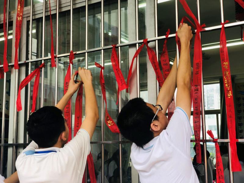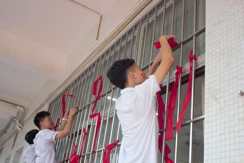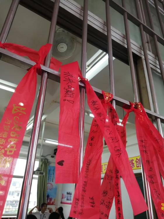 君中是一個很有愛的大家庭,奮斗的路上,我們從來都不會寂寞。同學(xué)們在紅絲帶上寫上對自己最想鼓勵的一位同學(xué)的祝福并親手送給對方,收到祝福的同學(xué)把紅絲帶系到走廊窗戶上。慢慢地,初三級的走廊就變成紅色的海洋,微風(fēng)不時吹過,撩動的是少年的心……放眼望去,還發(fā)現(xiàn)年級走廊的移動黑板展示著2019屆君蘭中學(xué)卓越班送給2020屆君蘭初三學(xué)子的祝福――《奔涌吧,后浪!》!