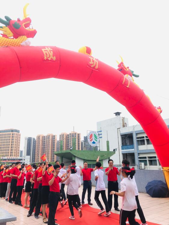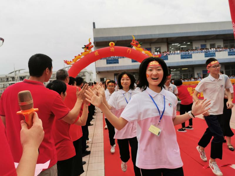 瞬時,同學(xué)們那渴望而又激動的眼神聚焦于“成功門”,仿佛那就是心之所盼的未來!各班的領(lǐng)隊同學(xué)都默默地緊握班旗的旗桿,在班主任的帶領(lǐng)下,同學(xué)們整理好額上的紅絲帶,邊氣勢如虹地高喊口號邊有序地走過“成功門”?!俺晒﹂T”兩側(cè)早有初三級的科任老師列隊靜候著,他們?yōu)槌跞龑W(xué)子搖旗吶喊,擊掌壯行,為這莊嚴的場面增添了一份溫情!
