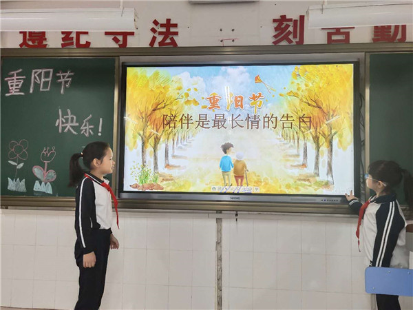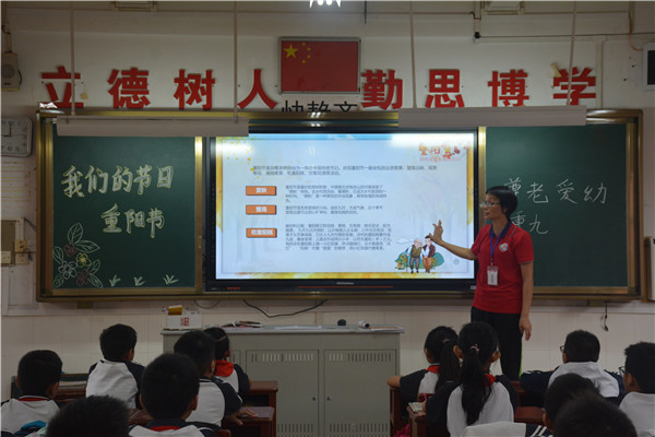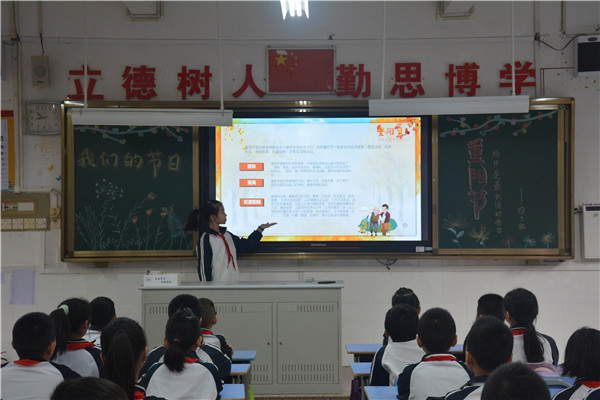 10月19日上午,各班還開展了“我們的節(jié)日?重陽(yáng)”主題班會(huì),向隊(duì)員們介紹中華傳統(tǒng)節(jié)日――重陽(yáng)節(jié)的來(lái)歷、習(xí)俗等,并開展了主題為“情暖金秋,愛在重陽(yáng)”的重陽(yáng)誦讀活動(dòng)。主題班會(huì)上,學(xué)生們不僅交流了對(duì)重陽(yáng)節(jié)的了解,知道了重陽(yáng)節(jié)的由來(lái),別名和各地的風(fēng)俗,還誦讀了一些有關(guān)重陽(yáng)節(jié)的詩(shī)句,讓中華優(yōu)秀傳統(tǒng)文化教育在校園里持續(xù)有效地進(jìn)行。